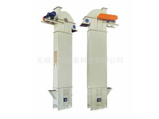 該機主要由殼體、牽引件(輸送鏈)、料斗、驅動輪(頭輪)、改向輪(尾輪)、張緊裝置、導向裝置、加料口(入料口)和卸料口(出料口)。料斗把物料從下面的儲藏槽中舀起,隨著輸送帶或鏈提升到頂部,繞過頂輪后向下翻轉,將物料傾入接受槽內。帶傳動的斗式提升機的傳動帶一般采用橡膠帶,裝在下或上面的傳動滾筒和上下面的改向滾筒上。鏈傳動的斗式提升機一般裝有兩條平行的傳動鏈,上或下面有一對傳動鏈輪,下或上面是一對改向鏈輪。斗式提升機一般都裝有機殼,以防止斗式提升機中粉塵飛揚。