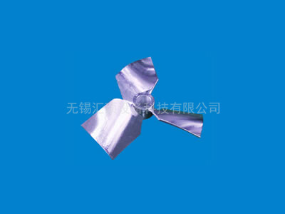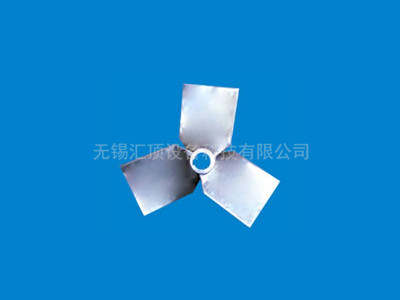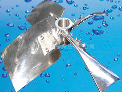 旋槳式攪拌器由2~3片推進式螺旋槳葉構成,工作轉速較高,葉片外緣的圓周速度一般為5~15m/s。旋槳式攪拌器主要造成軸向液流,產生較大的循環量,適用于攪拌低粘度(<2Pa·s)液體、乳濁液及固體微粒含量低于10%的懸浮液。攪拌器的轉軸也可水平或斜向插入槽內,此時液流的循環回路不對稱,可增加湍動,防止液面凹陷。